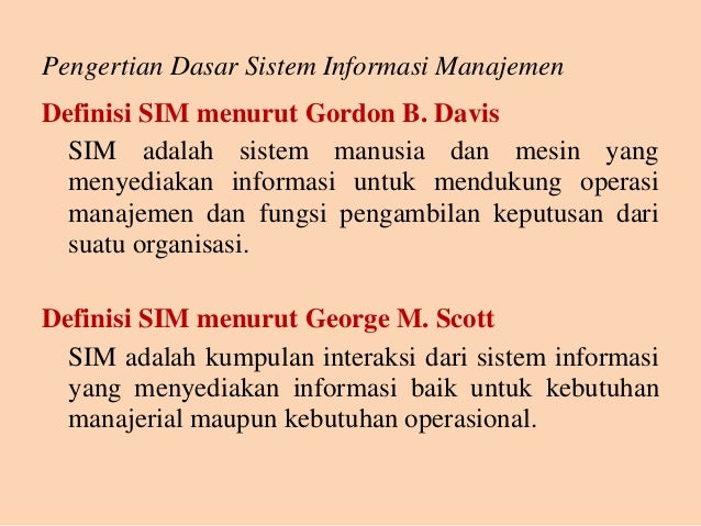 Sistem informasi manajemen sering sekali disebut dengan SIM, hasil dari SIM umumnya selalu menjadi pertimbangan untuk mengambil suatu keputusan dalam suatu organisasi. Dengan menggunakan Sistem Informasi Manajemen, berbagai macam pekerjaan yang ada hubungannya dengan analisis manajemen selalu bisa diselesaikan dengan cepat. Sistem Informasi Manajemen bisa berjalan secara baik bila didukung dengan teknologi yang canggih, sumber daya manusia yang berkualitas dan komitmen organisasi. Sistem Informasi Manajemen sangat bermanfaat untuk mendukung fungsi manajemen, operasional dan pengambilan suatu keputusan.
